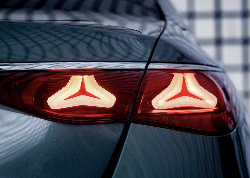 而车尾最引人瞩目的,当属其全新的尾灯设计了。新车尾灯采用了和EQ家族类似的贯穿式造型设计,不过中间部分并非灯组,而是黑色的贯穿饰条。尾灯轮廓同样是“花生”样式,与头灯交相呼应,内部则是两颗极其醒目的三叉星光源,在夜晚点亮后,别人一眼就知道你开的是全新E级,辨识度拉满。