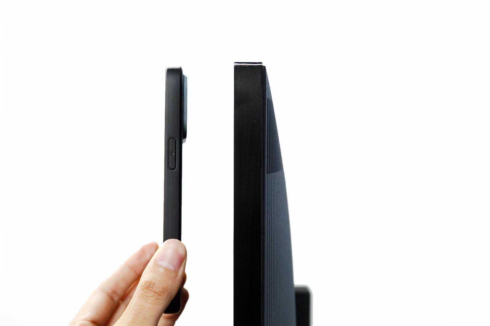 这里简单用手机做了对比,TCLQ10H电视的厚度差不多等同于1.5台iPhone的厚度。