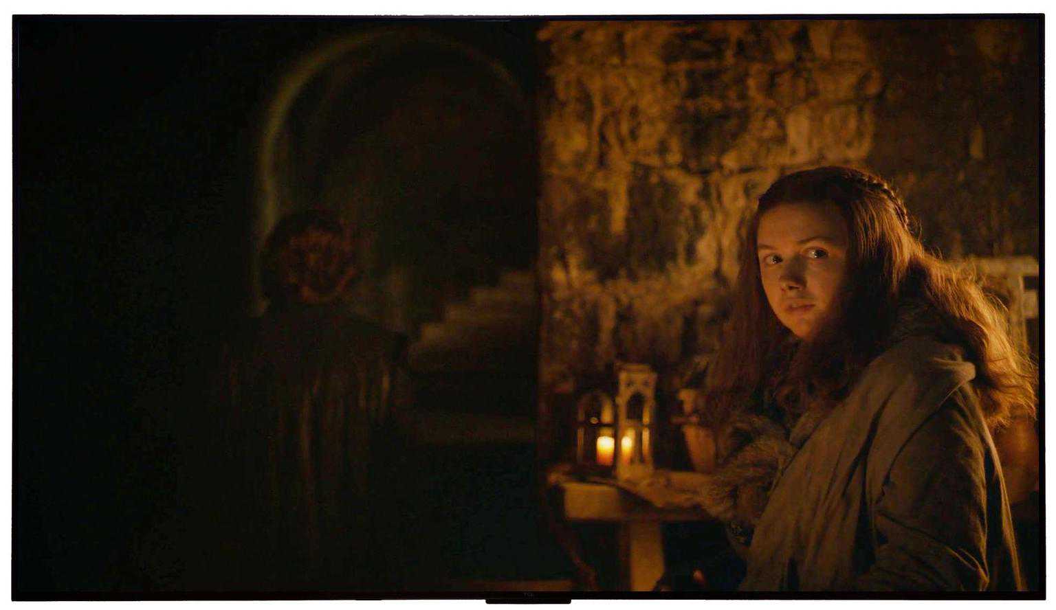 下面两张图来到了地狱级难度,《权力的游戏》的第八季第三集,左侧几乎是全黑的场景,右侧只有一缕火把灯光,但是还是可以看清人物的脸庞,甚至发丝都可以清晰可见。