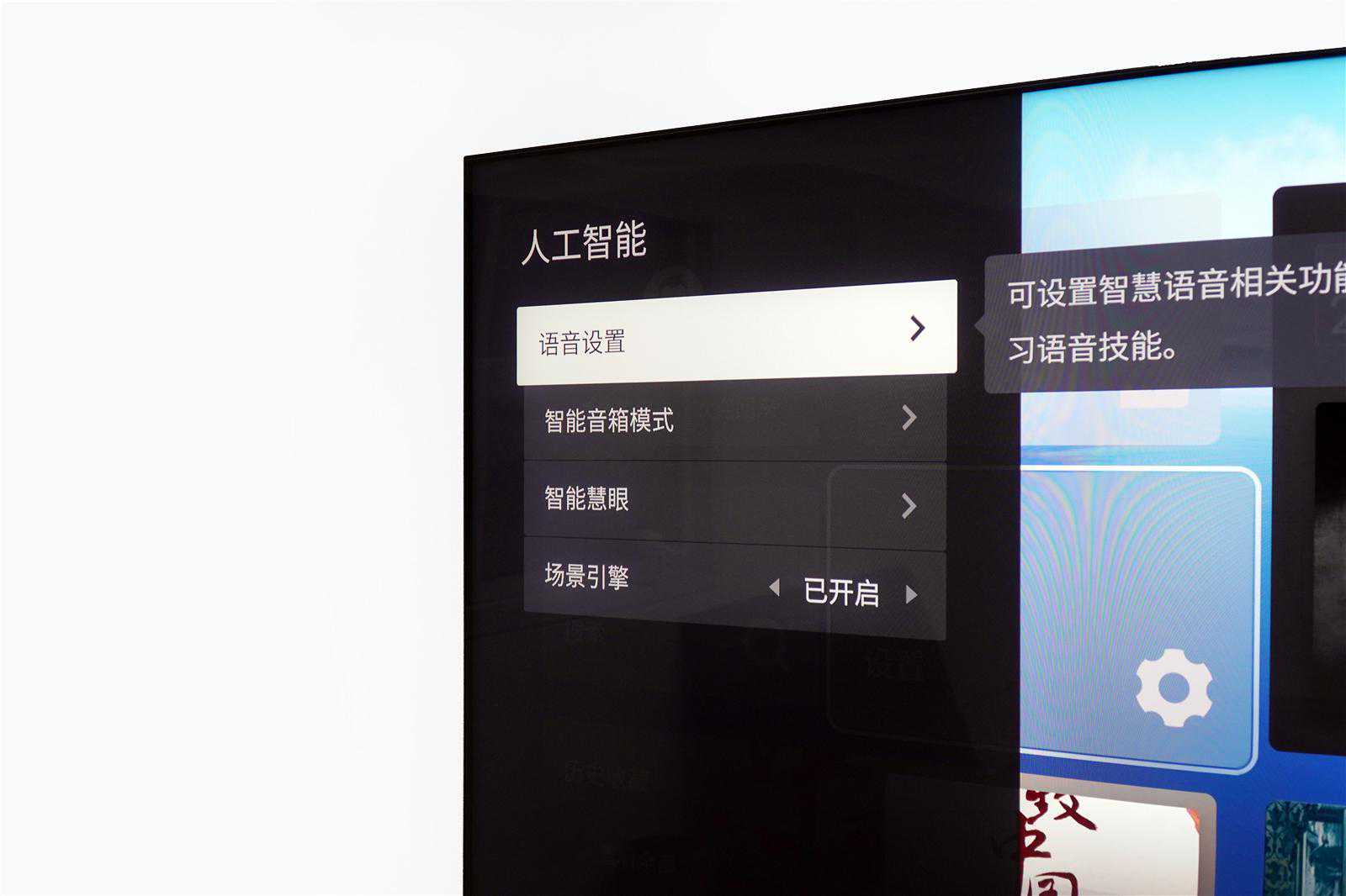 打开之后,主要有语音设置、智能音箱模式、智能慧眼、场景引擎四大选项。简单来说,这些功能都是为了提升交互体验,将传统的遥控器交互升级到了智能语音交互,而且电视还会根据场景的不同自动去匹配相关设置,用户全程都不用参与。