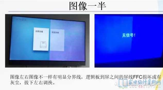 故障分析:逻辑板到屏之间的短软排线金手指偏移、断掉,有可能插入排查不当、腐蚀造成,故障为一侧束带、花屏、图像暗