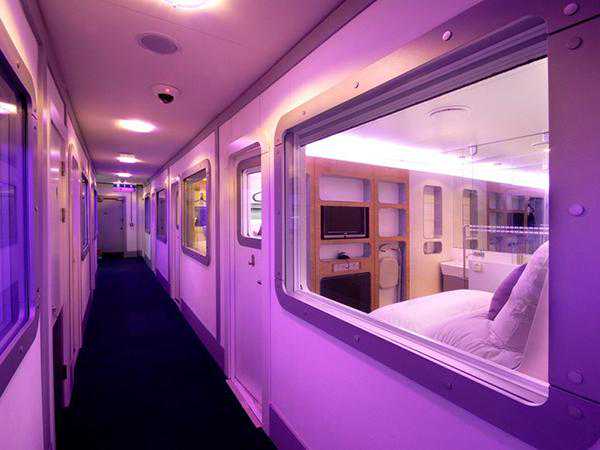 Yotel的设计在追求日式极致简约的同时,更融入了些许前卫的高科技感。在像ATM机的服务器上办好入住手续后,便会领到一张房卡,之后走进自动开启的旅馆大门,便走进了紫色灯光下的长长隧道,而两侧的一间间客房,更像一个个太空船舱。