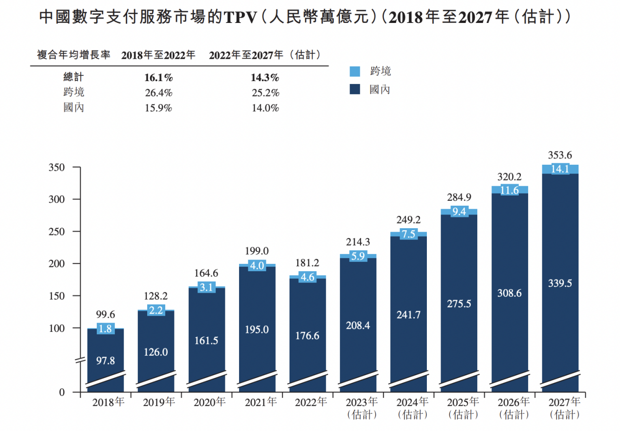 根据弗若斯特沙利文的资料,中国境内数字支付服务市场的TPV从2018年的人民币97.8万亿元增加到2022年的人民币176.6万亿元,2018年至2022年的复合年均增长率为15.9%,预计2027年将达到人民币339.5万亿元,2022年至2027年的复合年均增长率为14.0%。