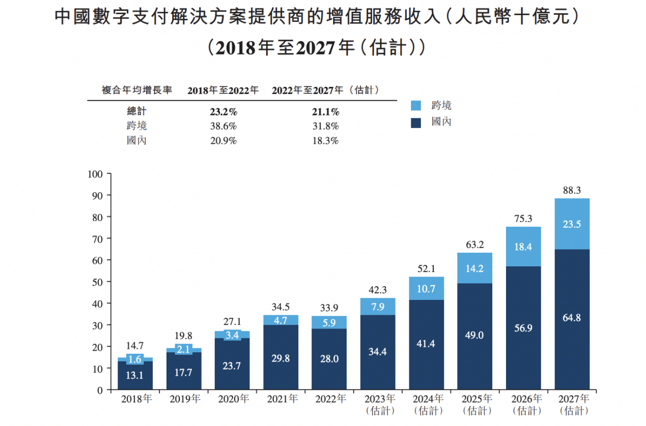 境内数字支付解决方案提供商的境内增值服务收入已由2018年的人民币131亿元增至2022年的人民币280亿元,2018年至2022年的复合年均增长率为20.9%,且预计将于2027年增至人民币648亿元,2022年至2027年的复合年均增长率为18.3%。