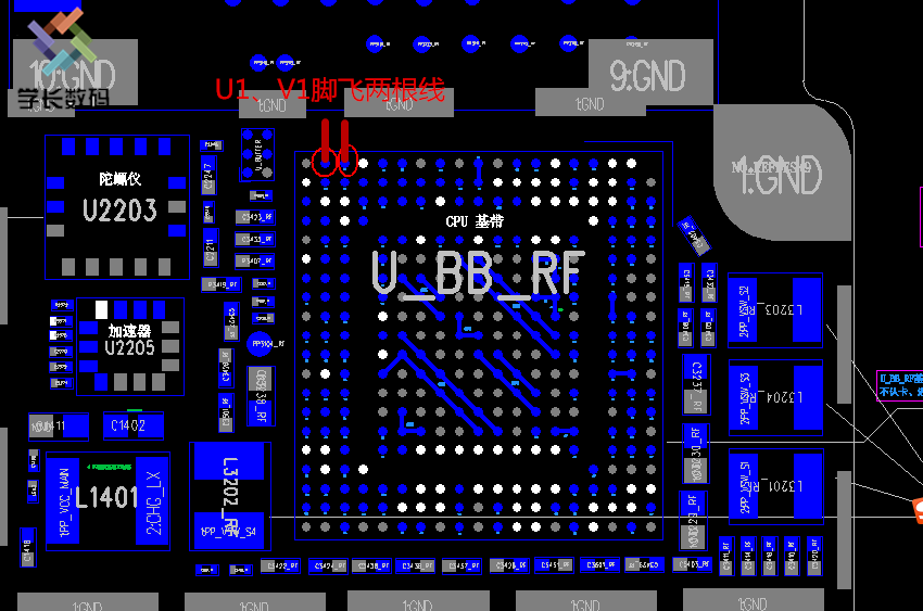 思路:设置关于手机里面,调制解调器固件和IMEI都有,拨号页面按*不出串号。这种一般是基带CPU的U1、V1角断线。这两个脚飞线重装回去80%这种故障都能解决。飞线后还是无服务我们再测供电IC的供电输出,无供电输出换功放供电。有供电输出再换天线开关、2G,4g功放,低频段功放、最后再射频IC。