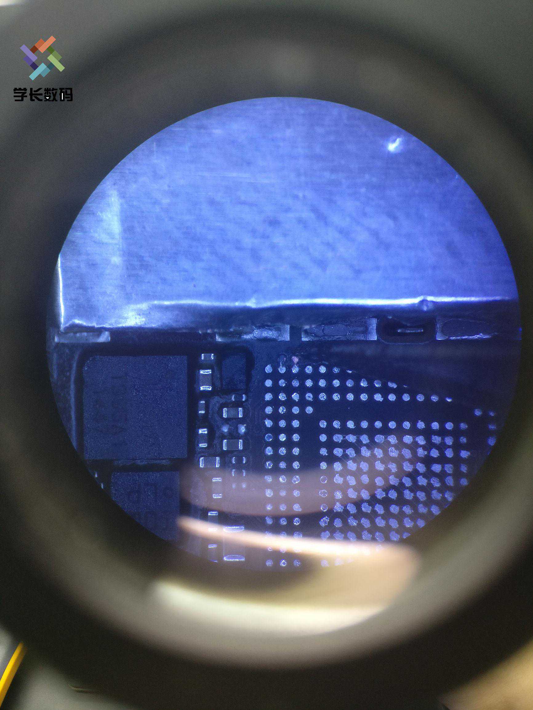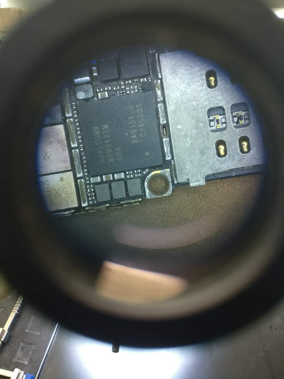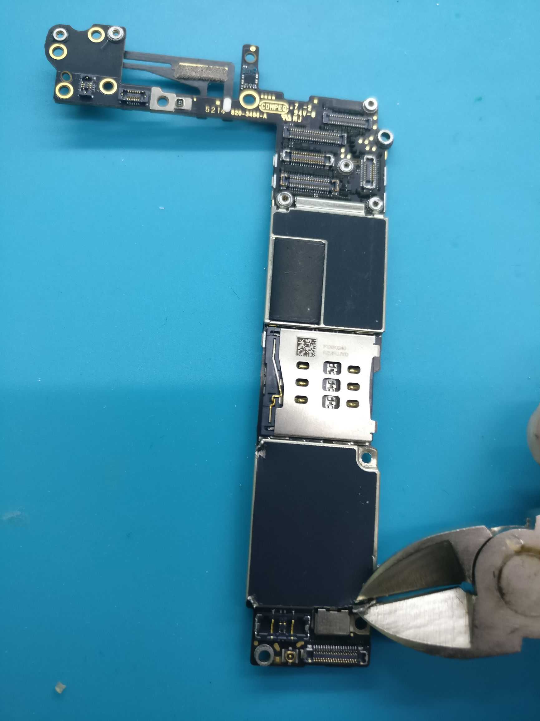 第三步:拆基带屏蔽罩,这里建议用斜口钳直接把屏蔽罩夹下来。用风枪拆的话,温度要360°,屏蔽罩焊锡融化了,屏蔽罩里面的芯片也融化了,一不小心动下主板很有可能里面的芯片全歪了。斜口钳夹下来的话就比较安全。