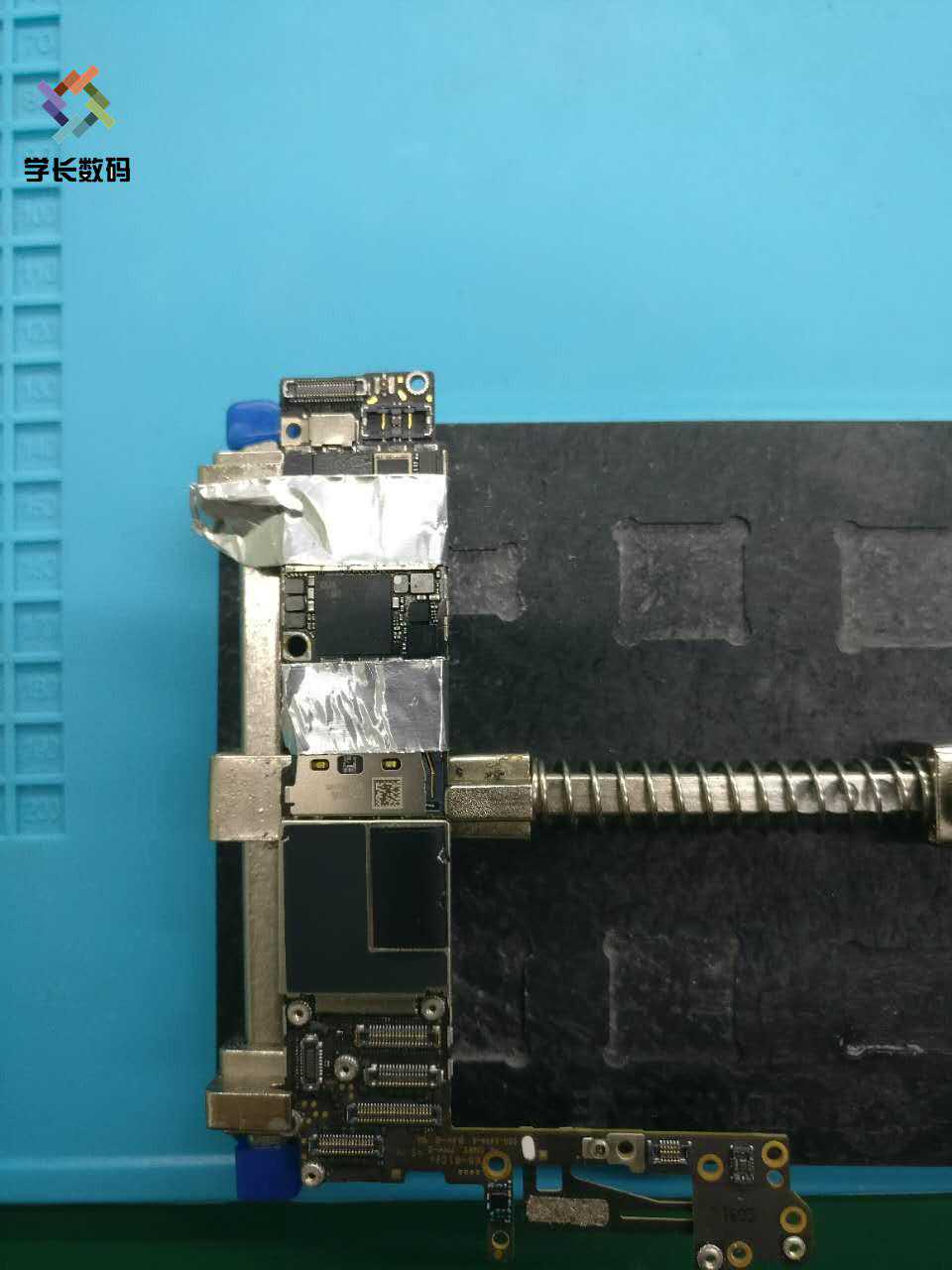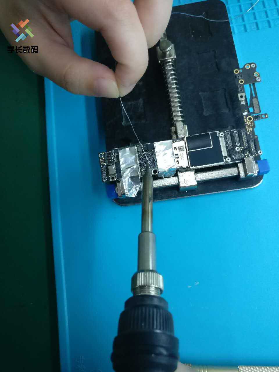 第四步:拆基带芯片风枪温度调到360°、风速50。接着基带两边先贴上锡箔纸,防止吹伤卡槽。苹果6代的基带没有胶,所以可以直接夹下来或者用镊子翘下来。
