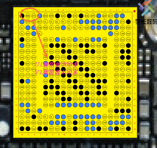 第七步:测量u1、v1脚阻值是否正常u1脚正常阻值300多,v1脚正常阻值400多。要是基带拆出来掉点了或者测出来阻值不对,这种基本飞完先就好了。要是测出来阻值正常,也要飞线,因为焊点测的时候是正常的,手机在运行的时候温度升高,焊点还是会虚焊。