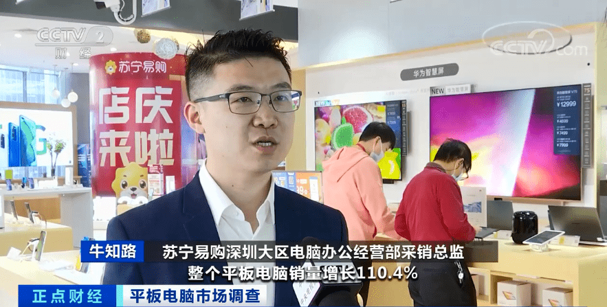 苏宁易购深圳大区电脑办公经营部采销总监牛知路:从2020年第二季度到年末,整个平板电脑销量增长110.4%,其中华为同比增长194%,iPad同比增长107%,还有新的品牌联想也杀入平板电脑的行列,2020年增长560%。2020年的2月到3月左右,我们的平板电脑基本上在市场上都是一货难求,某一些型号依然是缺货的状态。