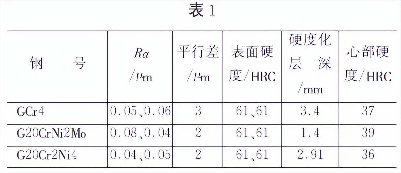试样的表面粗糙度Ra、平行差、表面硬度、沟道面硬化层深度(以50HRC为界)和心部硬度列于表1。