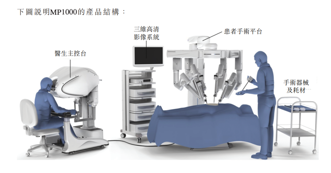 拆分产品结构来看,作为核心产品MP1000。主要由三部分组成:医生主控台、患者手术平台及三维高清影像系统。
