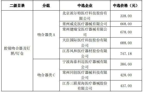 值得注意的是,今年8月13日,湖南省公布了《湖南省2020年度医疗机构部分医用耗材集中带量采购中选结果》,其中,腔镜吻合器在湖南集采中,已降至千元范围,最低中标价为338元。