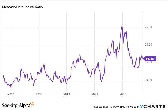 估值倍数不仅绝对值高,而且与公司自身的历史相比也高。它通常在10倍到15倍的销售额之间交易,目前约为16倍。部分扩张可归因于金融科技业务的比例不断增长,但目前很难说股价便宜。