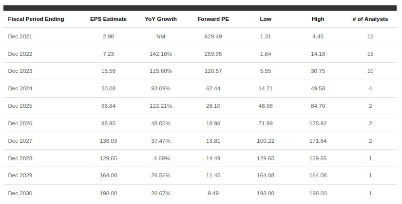根据SeekingAlpha编制的分析师估计查看特征收益,我们看到从2026年左右开始,股票的市盈率倍数开始看起来便宜。如果投资者是长期投资者并认为这些估计是准确的,那么一个案例可用于购买股票。