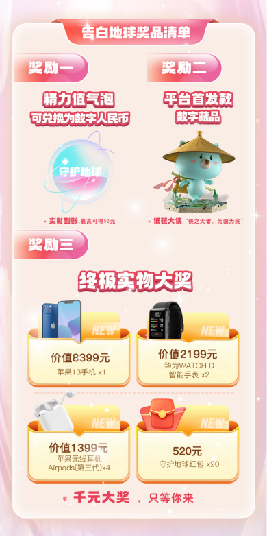 报名参与活动,即可得万份金额不等的“守护地球”精力值气泡,最高直接兑换52元数字人民币,实时到账。