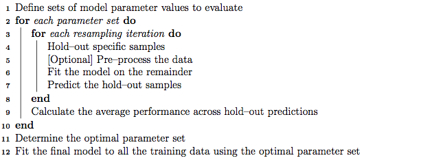 Caret依赖trainControl函数设置交叉验证参数,train函数具体训练和评估模型。首先是选择一系列需要评估的参数和参数值的组合,然后设置重采样评估方式,循环训练模型评估结果、计算模型的平均性能,根据设定的度量值选择最好的模型参数组合,使用全部训练集和最优参数组合完成模型的最终训练。