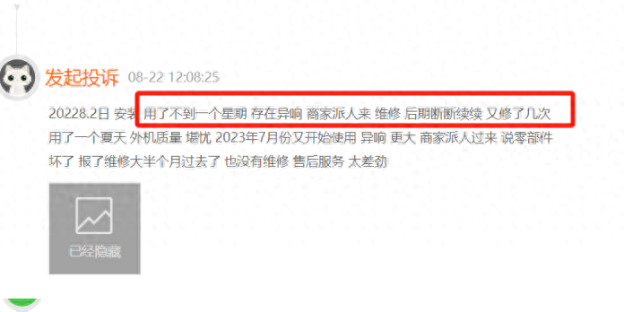 去年8月份,有消费者投诉称,其购买的空调用了不到一个星期,存在异响。商家派人来维修,后期断断续续又修了几次,一年后又开始使用,异响更大。