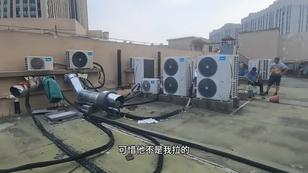我找到了问题所在,就是这根铜管。这根铜管确实很长,为什么要拉这么长呢?可惜我不是拉铜管的人,钱被别人赚走了。不过老板人还不错。我的铜管没赚到钱也没关系,我可以帮你介绍生意。兄弟们,你们觉得这根铜管值多少钱一米?这只是其中的一部分。这个小工地里有很多台空调,这只是其中的一部分。