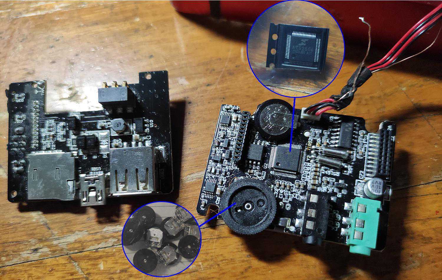 电路板分两层,上层主要是接口,下层是主电路。测量TF卡座正常,中间连接线路及经过的元件未发现损坏,初步判断为主控芯片(ATS2506)部分功能损坏。