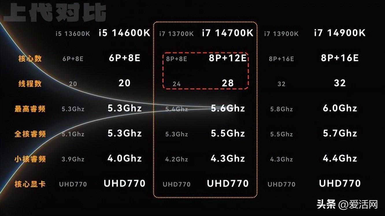 那要说此次intel发售的3款带KCPU,大家会发现在架构没有大变动的情况下,14600K和14900K,相较于上代的提升可以说只是常规升级,架构由RaptorLake(13代)升级为RaptorLakeRefresh(14代),这两款CPU在核心/线程,甚至于缓存方面,都没有明显升级,而在频率方面,则是大核全核睿频统一拔高了0.2GHz,小核提升了0.1GHz,只能说是升级比较常规。而相较于14600K和14900K,此次发布的14700K则明显看点颇多,除了常规的主频提升以外,核心数量也有了明显升级,增加了4个小核,由8P+8E升级到了8P+12E的配置,整体多核提升了约17%,这可是相当重磅的升级。