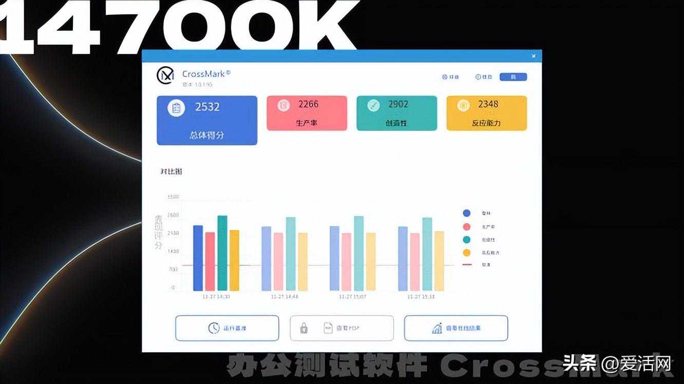 首先是综合性的办公测试软件CrossMark,14700K的表现可以说相当不错,总分2532分,生产率2266,创造性2902,反应能力2348,表现优秀。这个成绩相较于上代提升有100分左右。顺带一提,CrossMark为免费软件,大家可以在微软商店免费下载跑跑自己电脑,看看得分~