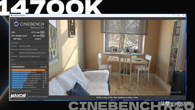 接下来是R20,最终单核827多核13774。【13700K成绩单核804,多核11845;13900K成绩单核826,多核14880】