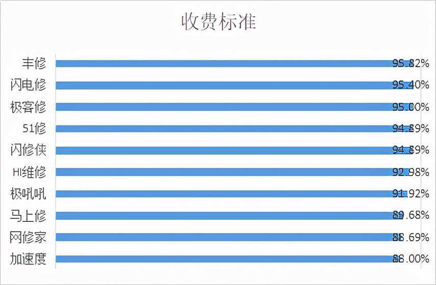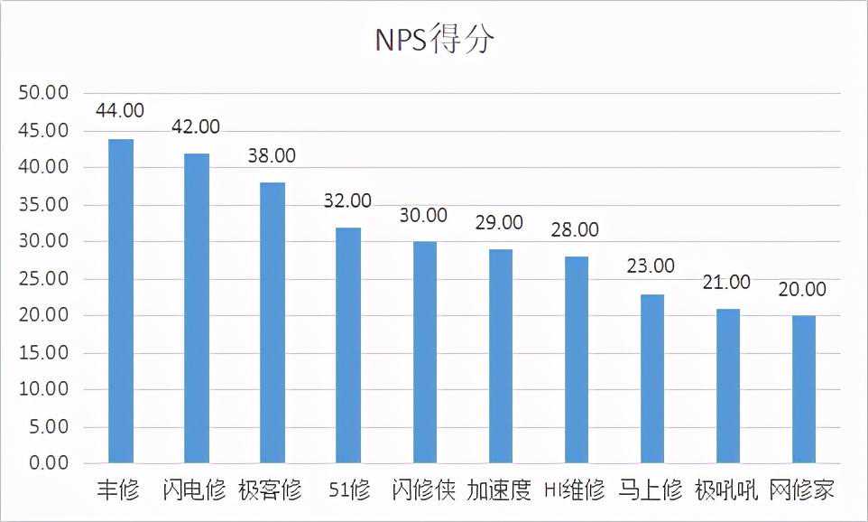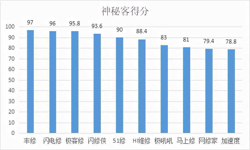 神秘客调查采用百分制考核标准,10个平台平均分值为88.30分,整体体验较好。神秘客调查的前三名依次为:丰修(97)、闪电修(96)、极客修(95.8)。