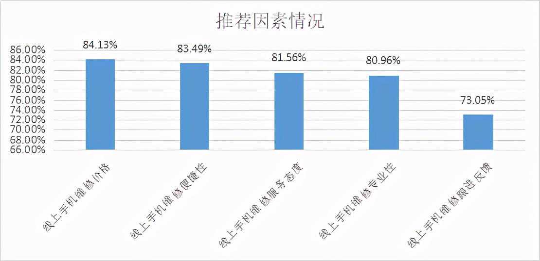 NPS口碑调查的各维度数据显示,维修价格是消费者选择线上手机维修平台的首要原因,推荐比例为84.13%;其次是维修便捷性(83.49%)和服务态度(81.56%)。