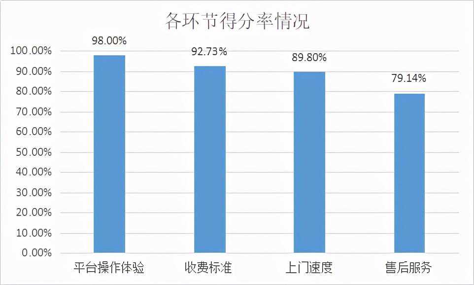 在各项考察指标中,得分率最高的是平台操作体验,为98%;其次是收费标准(92.73%)和上门速度(89.80%),得分最低的是售后服务,为79.14%,主要原因是部分平台缺少投诉通道。