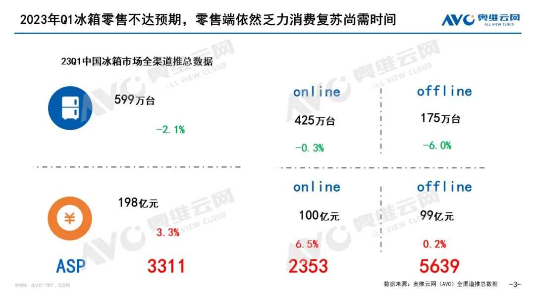 据了解,今年一季度冰箱市场线上销量为425万台,同比下跌0.3%;零售额为100亿元,同比增长6.5%。而在线下市场,零售量则是175万台,同比下跌6%;零售额为99亿元,同比增长0.2%。