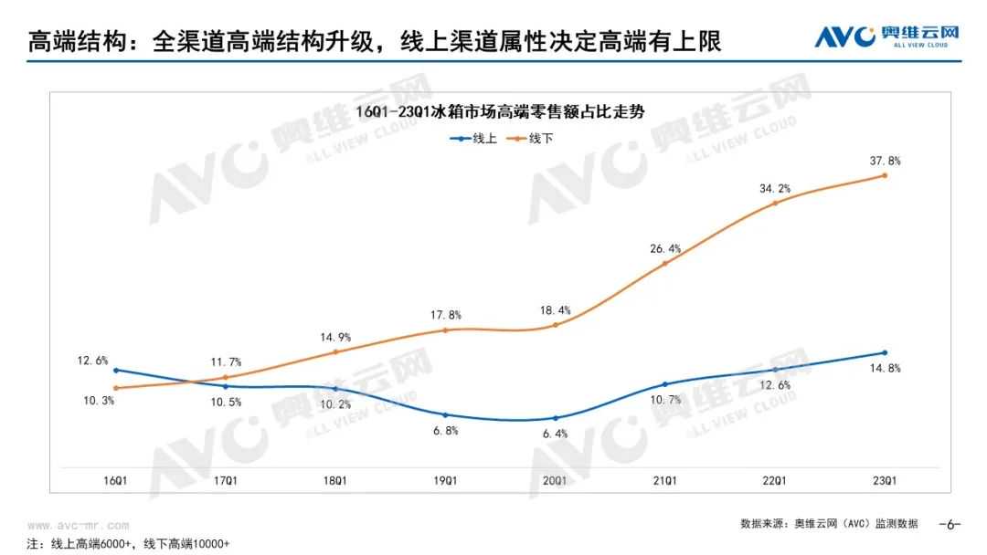 得益于产品容量升级,加上设计在朝着轻薄高颜值方向进发,推动冰箱行业向着高端化市场转移。从近几年冰箱市场高端产品零售额占比走势中能发现,2019年线上、线下渠道的占比分别为6.8%、17.8%,而到了今年一季度该占比已分别提高到14.8%、37.8%,翻了一倍有余。这说明,高端化、大容量产品越来越受消费者的青睐,用户需求转变也促使着冰箱的品质快速升级。