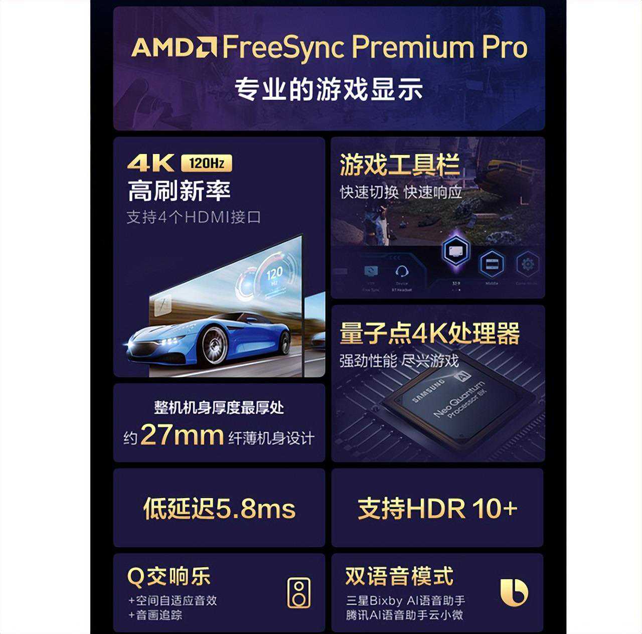 游戏方面,其具有120Hz高刷,4个,支持VRR可变刷新率,ALLM自动低延迟,具有5.8秒低延迟,并且还有个游戏工具栏,这就是针对游戏进行了最细致的优化了。