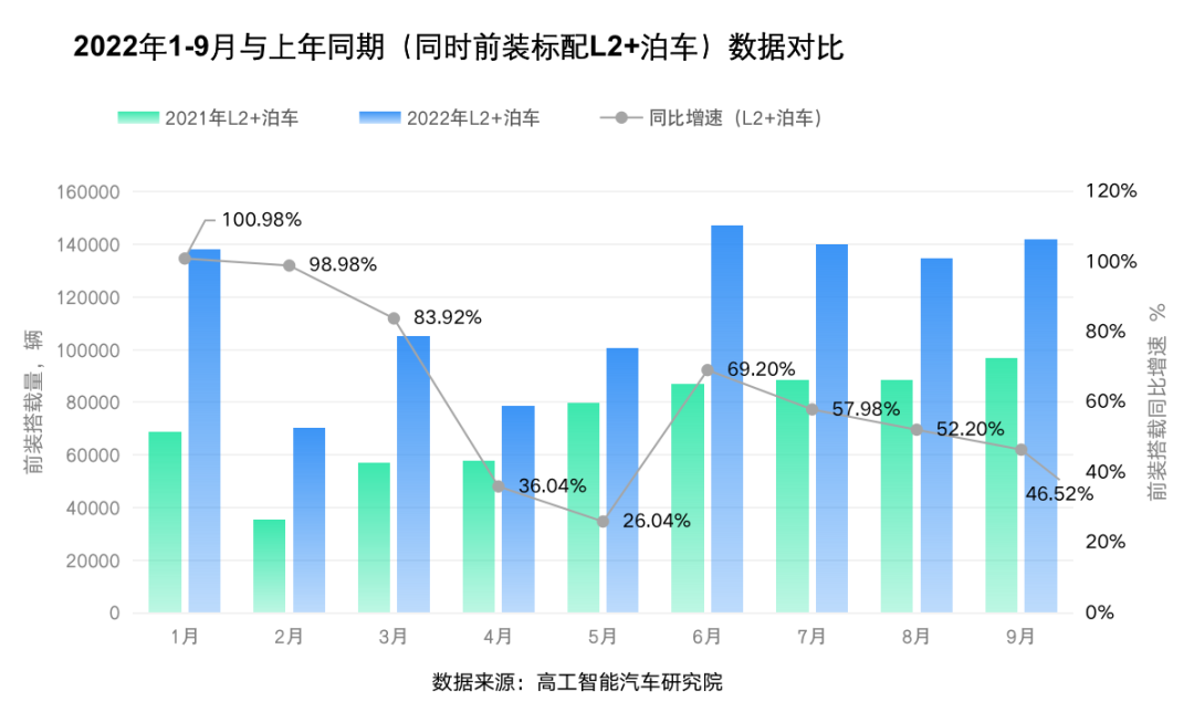 在具体数据方面,今年1-9月同时搭载行车L2+泊车功能(包含传统分布式ECU架构)的交付上险呈现上半年高开低走,下半年逐步回升的趋势,尤其是进入6月份,保持平均50%的同比增长。