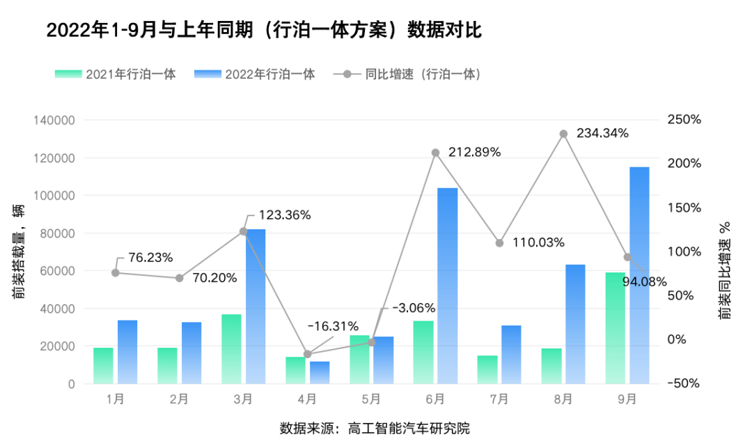 高工智能汽车研究院监测数据显示,2022年1-9月中国市场(不含进出口)乘用车前装标配搭载行泊一体域控制器交付上险为49.85万辆,同比增长117.12%,搭载率为9.75%。