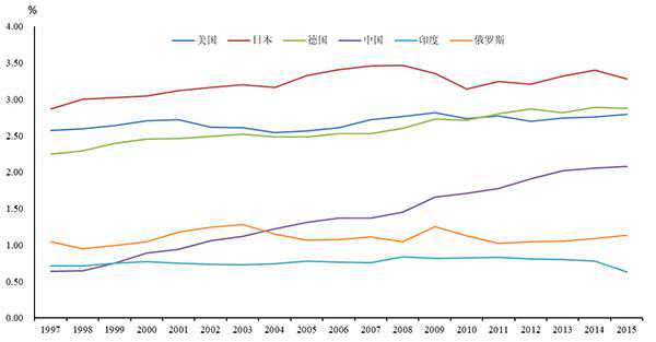 中国科技创新整体能力不断提高。从研发投入看,中国政府和企业对科研创新的重视程度正在不断加强,2017年研发投入总量达到1.75万亿元,仅次于美国,居世界第二位;同时,研发投入占GDP比重不断增长,2017年达到2.12%。按照“十三五”规划,到2020年,研发投入占GDP比重将达到2.5%以上,达到发达国家投入水平,远超其他发展中国家并且与美国差距进一步缩小。(参见图2)