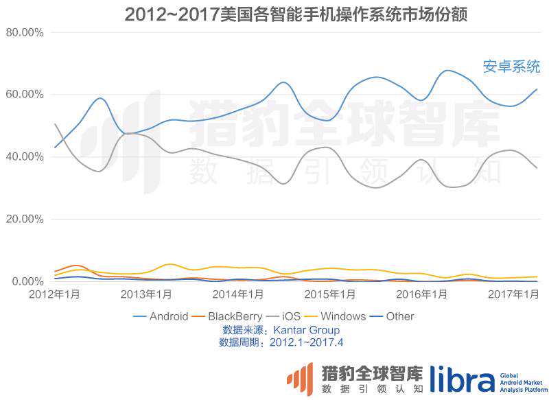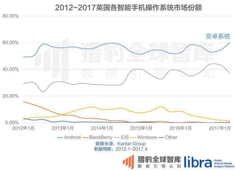 英国是智能手机出货量最大的西欧国家。安卓手机在英国市场上的占有率保持在50%~60%之间,相对稳定。