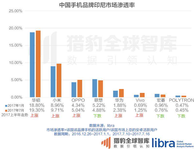 2017上半年,华硕、小米、OPPO、华为、vivo在印尼都有一定程度的上涨。