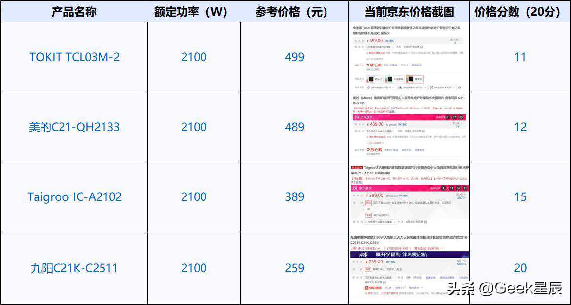 首先来看下这四款电磁炉产品的功率以及价格进行打分(该环节分值为20):