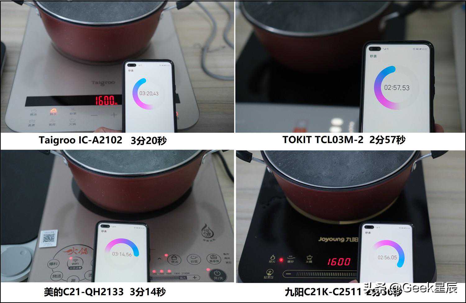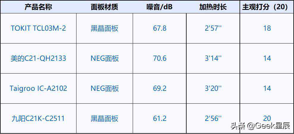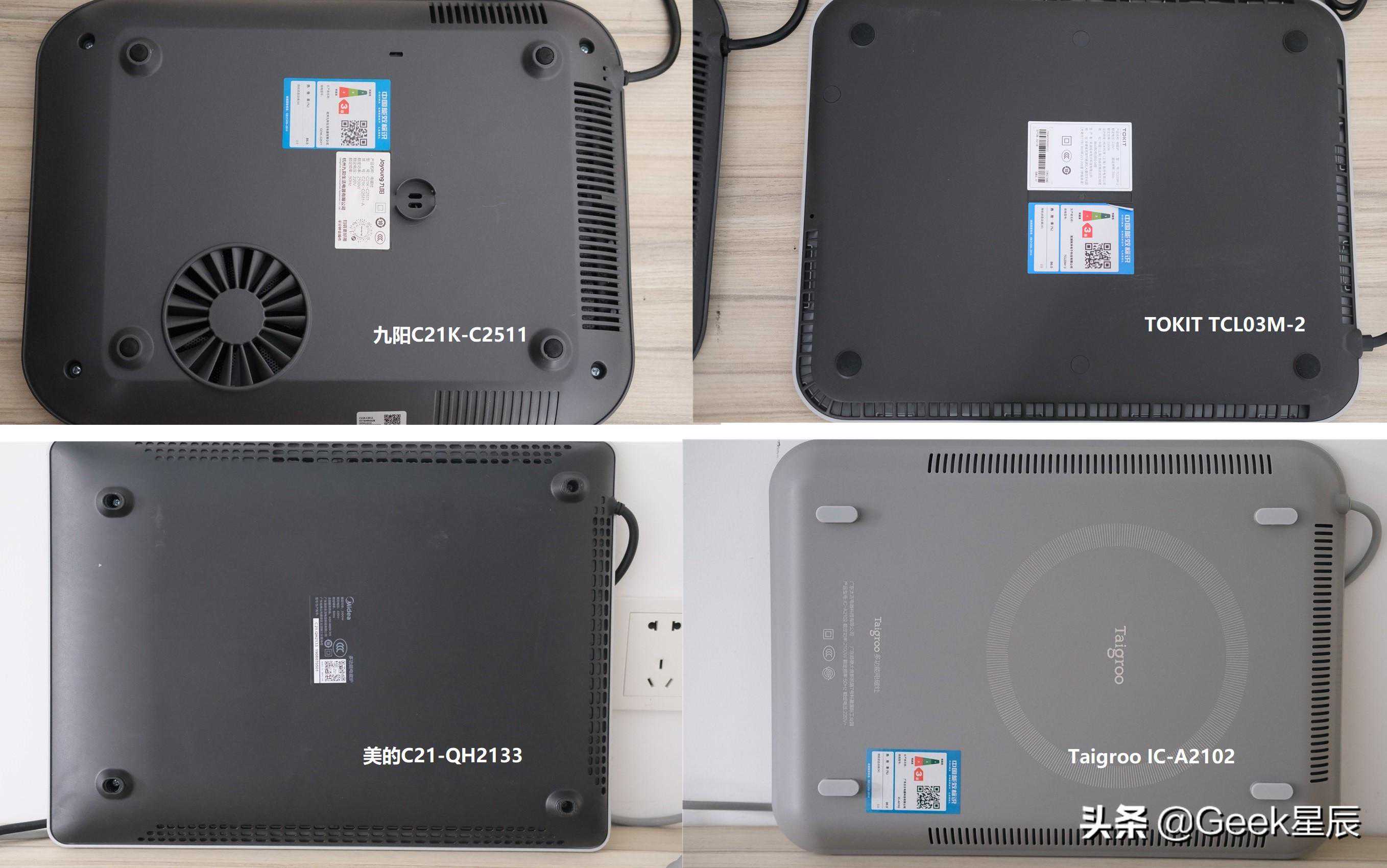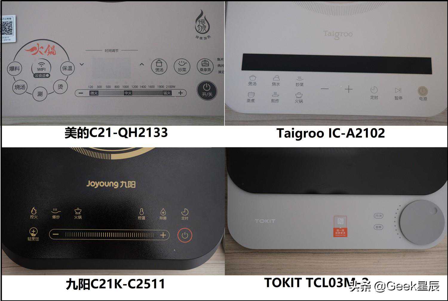TOKITTCL03M-2、美的C21-QH2133、TaigrooIC-A2102以及九阳C21K-C2511四款采用不同面板,TOKITTCL03M-2以及九阳C21K-C2511采用黑晶面板,而美的C21-QH2133、TaigrooIC-A2102采用了NEG面板,所以在加热以及热效率方面会有差别。
