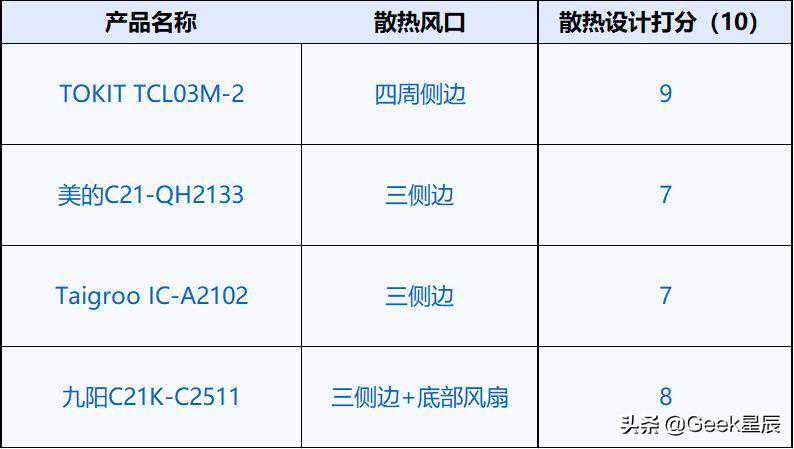TOKITTCL03M-2、美的C21-QH2133、TaigrooIC-A2102以及九阳C21K-C2511背部散热出口如下,设计上TOKITTCL03M-2采用四周侧边散热出口设计,九阳C21K-C2511则采用传统底部大风扇散热且三侧出风口小,其他两款散热口区域也较少,不过没有采用底部散热。