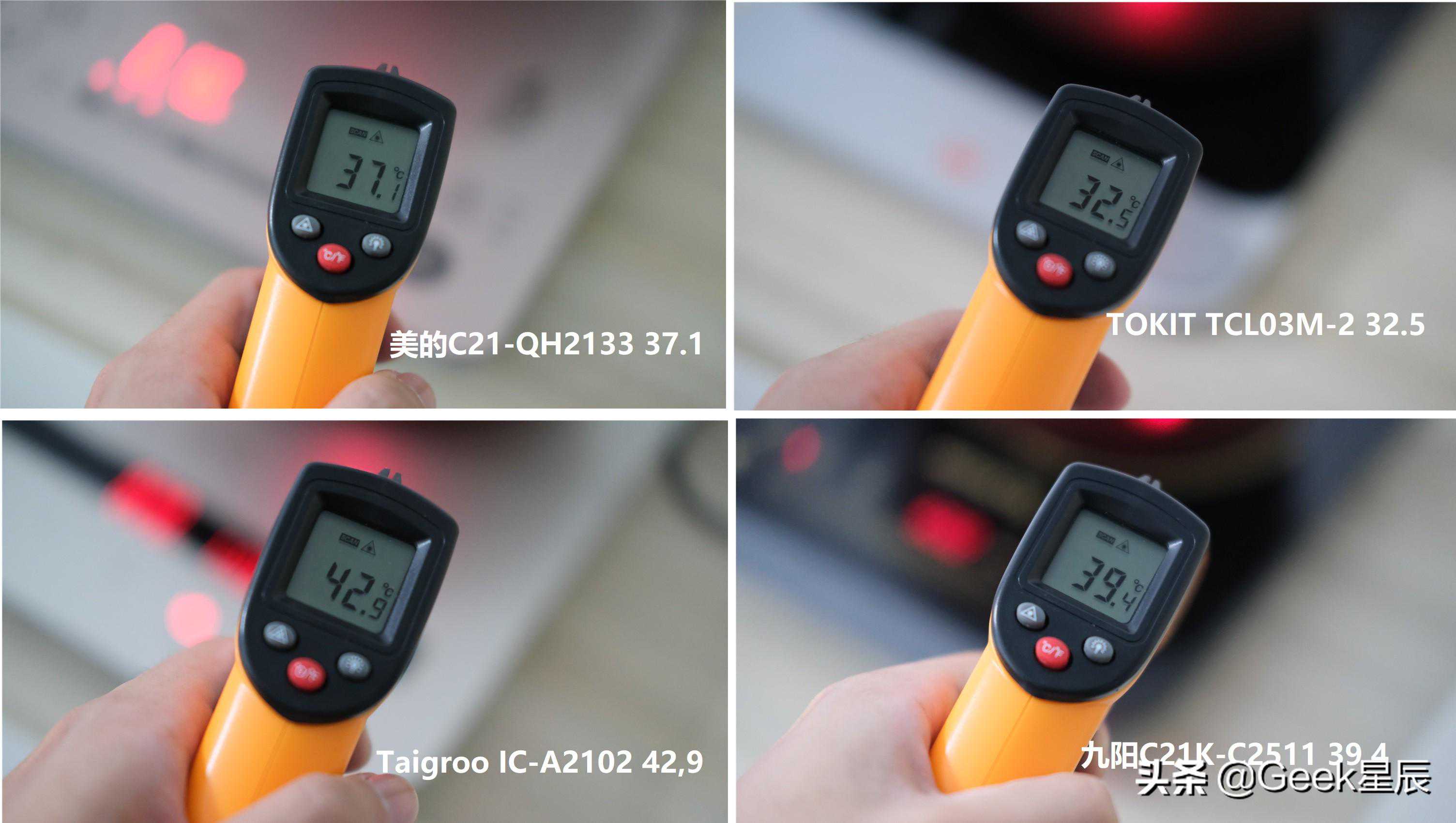 下面测试的温度均是锅内水沸腾的时候,操作区域的温度,可以看到TOKITTCL03M-2温度是四款中最低的,只有32.5度,而TaigrooIC-A2102则达到42.9,虽然操控温度不高,但也从安全烫手方面来讲还是略逊其他三款。