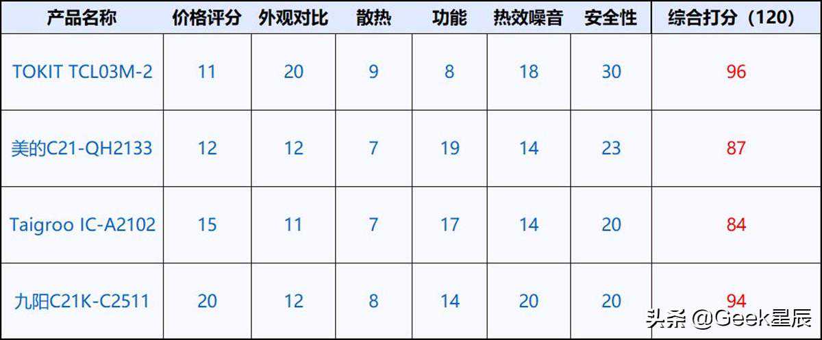 首先对TOKITTCL03M-2、美的C21-QH2133、TaigrooIC-A2102以及九阳C21K-C2511四款电磁炉每项得分进行分值汇总如下(总分值120分):
