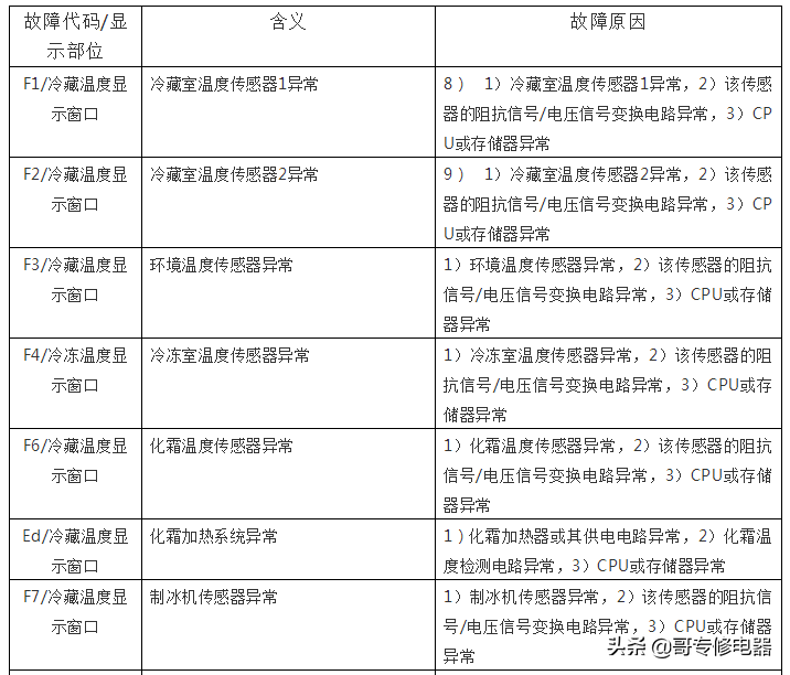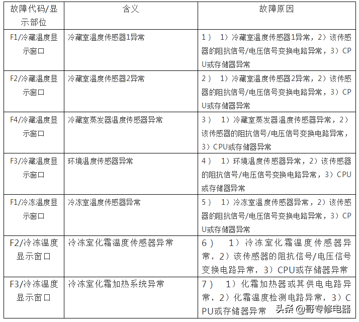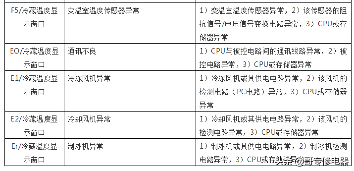 表2海尔518WS液晶显示系列电冰箱故障代码与故障原因: