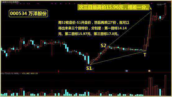 如图二000534万泽股份图表所示,用S2收盘价-S1开盘价,然后再乘上T价,就可以得出未来上升三个目标价,它们分别是:第一目标14.14元,第二目标15.97元,第三目标17.8元。而股价实际走势于次三日最高上涨至15.96元后开始回落,低于目标价一分,便展开调整,即图中走势,未来股价还将继续上冲第三目标,不过由于完成第二目标后,开始调整,未来上涨目标将要重新计算。