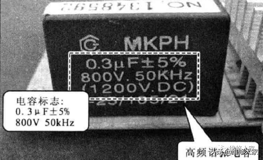 高频谐振电容主要与炉盘线圈形成LC振荡电路,常用的高频谐振电容其容量为0.27(1±5%)uF或0.3(1±5%)uF。下图所示为高频谐振电容。从图中可以读出该电容的标志为“0.3uF±5%800V50kHz(1200VDC)”,其中,“0.3uF土5%”表示电容量为0.3(1±5%)uF,“800V50kHz”表示工作条件为800V交流电50kHz,“1200VDC”表示额定直流电压为1200V。