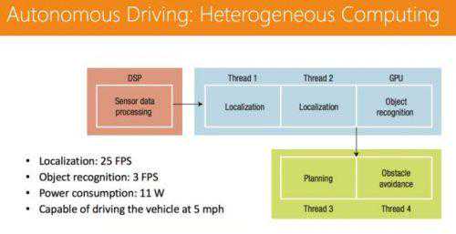 下图显示了一个面向基于视觉的无人驾驶的移动SoC系统组成。在这个移动SoC实现中,我们利用DSP处理传感器数据,如特征提取和光流;我们使用GPU完成深度学习任务,如目标识别;采用两个CPU线程完成定位任务以实现车辆实时定位;我们使用一个CPU线程实现实时路径规划;使用另一个CPU线程进行避障操作。如果CPU尚未被全占有,多个CPU线程则可以在同一CPU核心上运行。