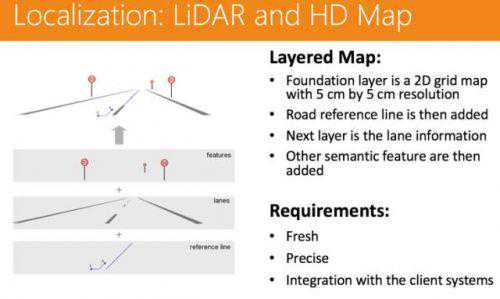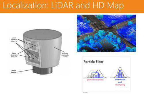 激光雷达的好处是有一定的射程,能触及100-200米的距离,能很精准的得到空间中的点(3D点云)。将激光雷达的数据和高精地图的数据做一个匹配,可以将车辆定位上升到厘米级别。