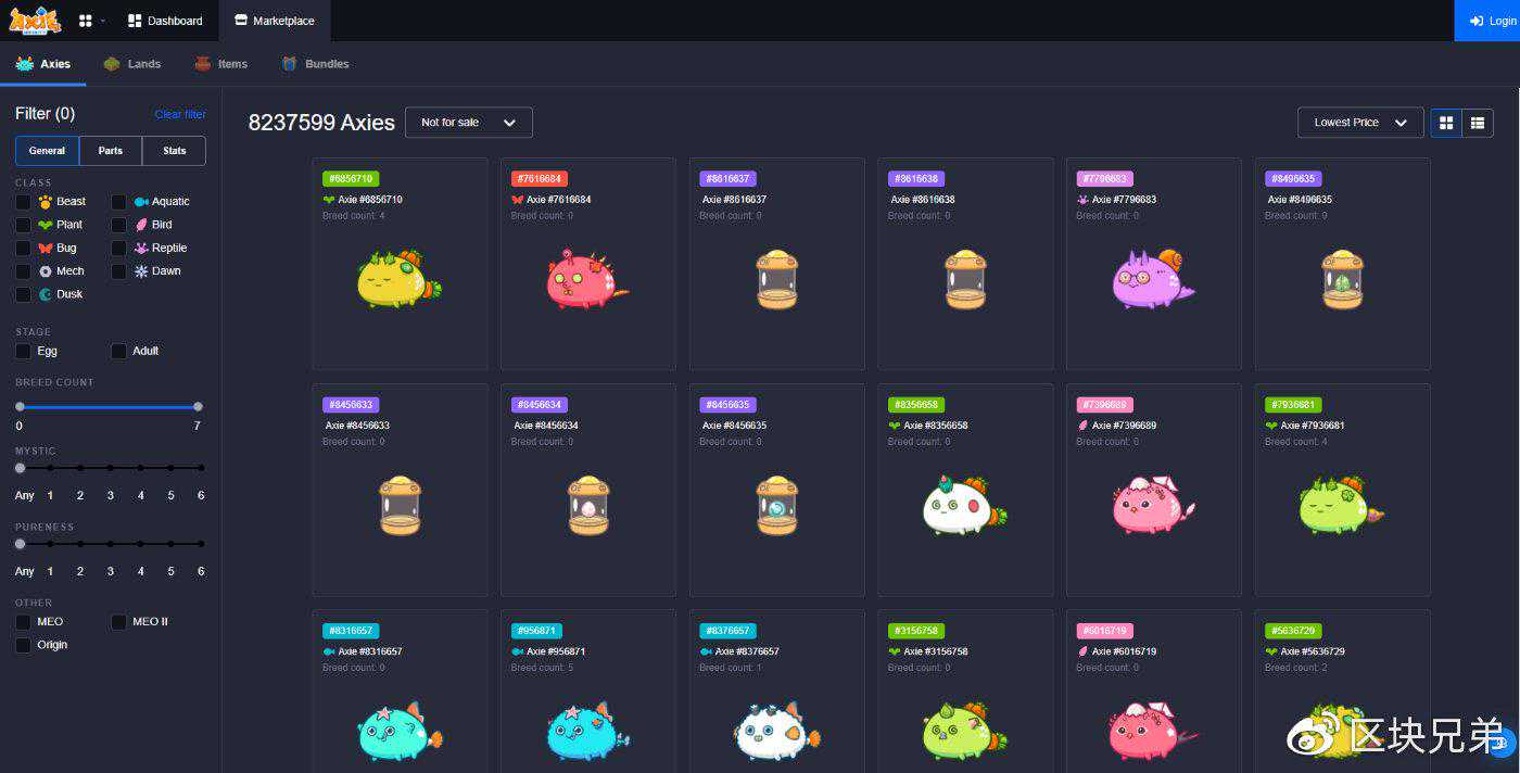 据AxieInfinity官网显示,目前总共有8237599只宠物精灵待出售,玩家可通过左侧的筛选条件进行购买,等级、属性、稀缺性不同,价格不同。8月份,AxieInfinity宠物市场近30日内交易了170万次,总交易额达到了10.4亿美金,平均每只Axie的售价达到了611美元,远超其他同类游戏。