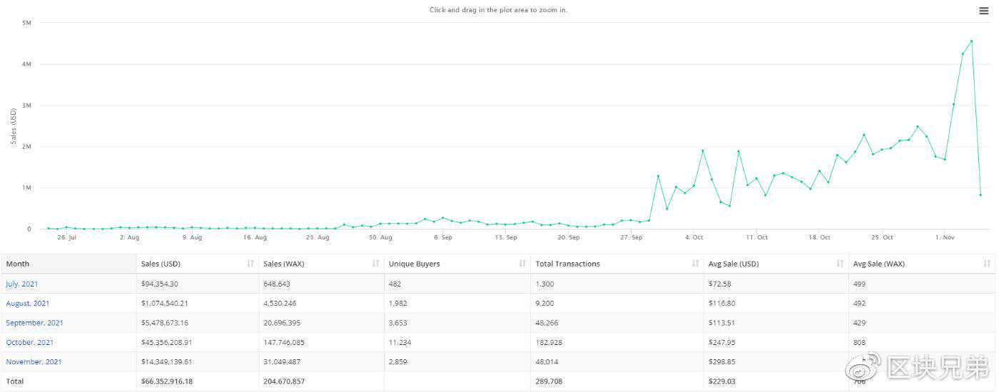 FarmersWorld推出几个月以来,交易量飙升,七月的交易额为94354美元和648WAX,10月的交易额就突破了1000万美元和25200个WAX,增幅超过100倍,目前在WAX上交易额排名第一。过去24小时的销售额为4885612美元,排名第三,仅次于AxieInfinity和CryptoPunks。