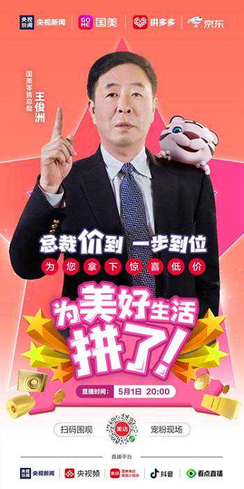 5月1日20点,央视新闻与中国家电连锁零售巨头国美零售联合发起一场家电直播盛宴。本次直播,央视新闻主持人朱广权、撒贝宁、康辉、尼格买提组成的“央视Boys”将与国美零售总裁王俊洲为用户带来包括海尔、华为、格力、美的、海信、TCL、方太、老板、荣耀、小天鹅、莱克等知名品牌的生活家电、数码3C等产品,并在这场直播中推出了前所未有的爆款商品全网超低价抢购活动。